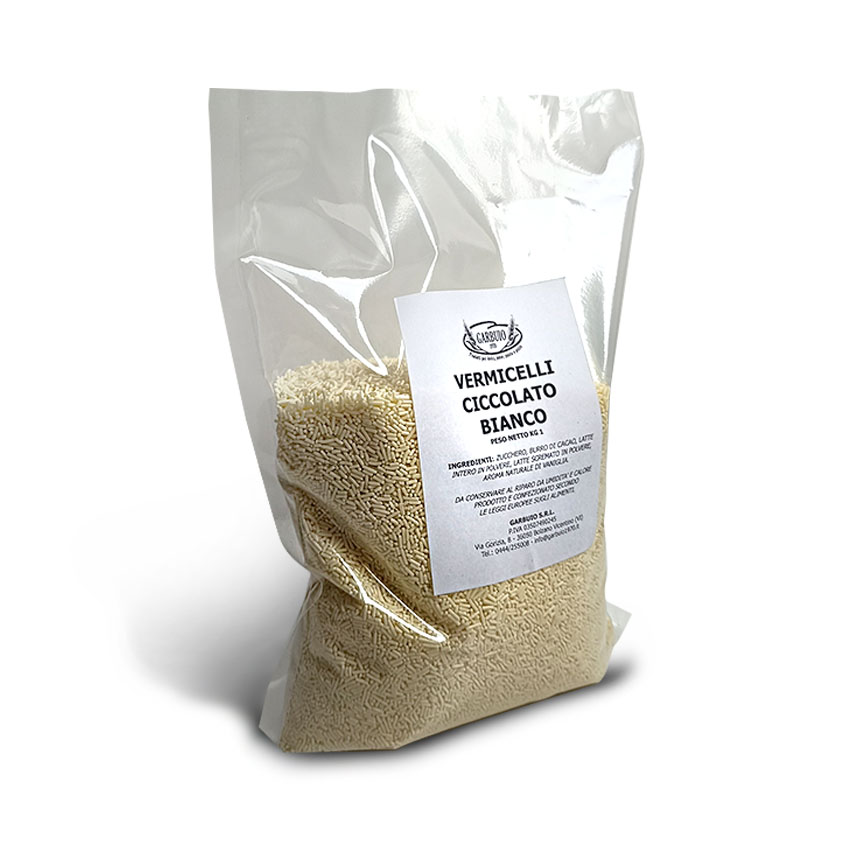 VERMICELLI CIOCCOLATO BIANCO KG.1 Ingredienti: Zucchero, burro di cacao, latte intero in polvere, latte scremato in polvere, aroma naturale di vaniglia.
